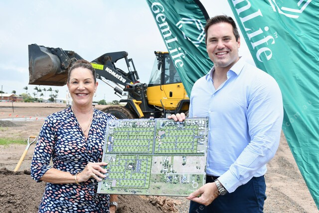 GemLife Managing Director and Group CEO Adrian Puljich and Bundaberg Mayor Helen Blackburn with the development plan. (Tahlia Facer: 514847)