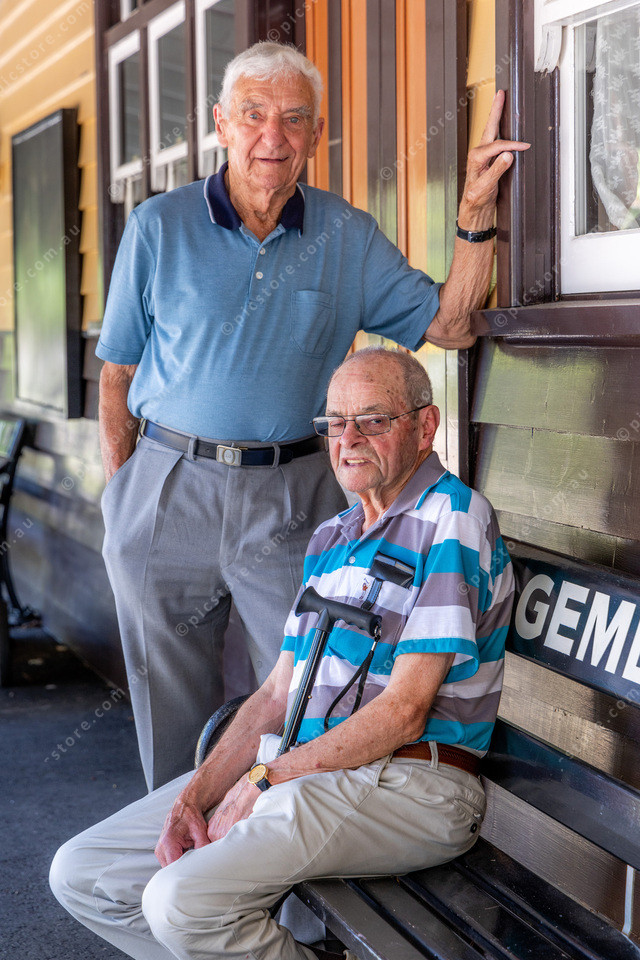 L-R Harold Ramage (Standing) and Norm Smith (Sitting) at Gembrook Railway Station. (Puffing Billy).