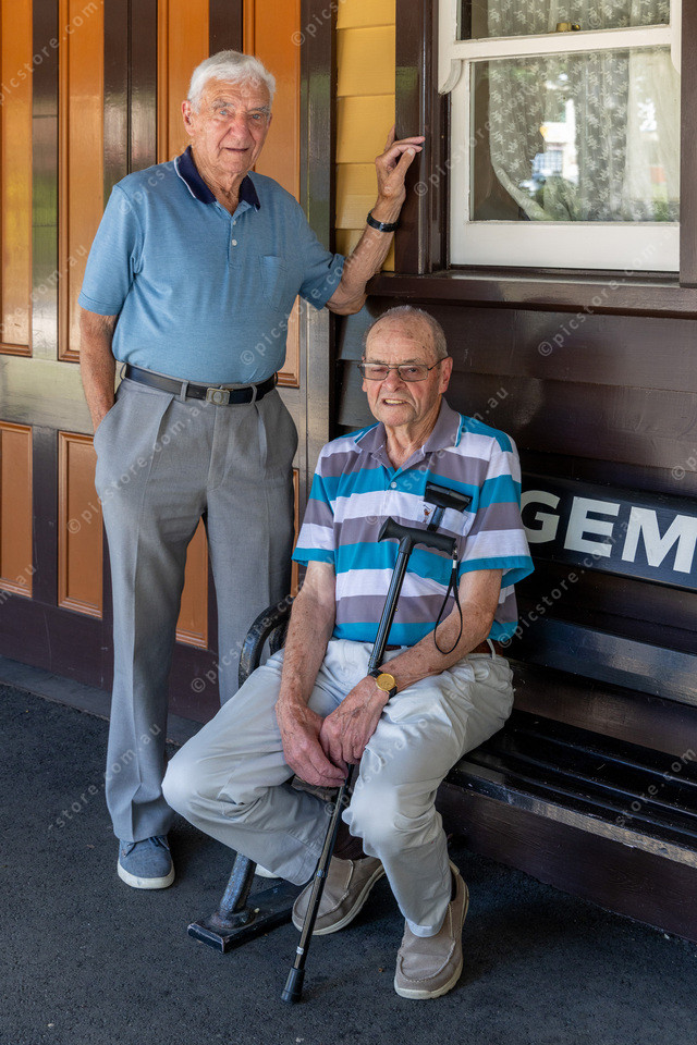 L-R Harold Ramage (Standing) and Norm Smith (Sitting) at Gembrook Railway Station. (Puffing Billy).