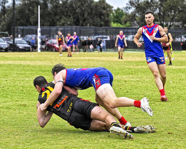 Jack Driver puts a solid tackle on Joel Edwards (Ivan Kemp) 473877_19