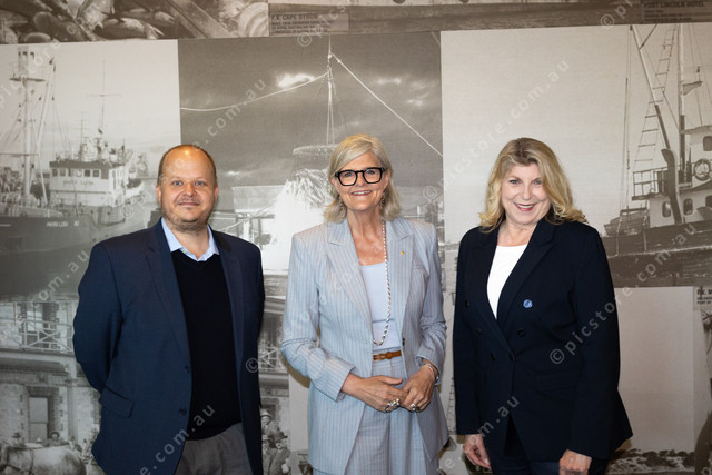 Governor-General of Australia Sam Mostyn with Port Lincoln City Council chief executive officer Eric Brown and mayor Diana Mislov. (Mitchell Paterson: 512249_01)