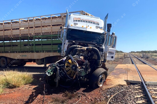 MANGLED: The mangled prime mover, still with trailers attached, sits next to the rail line after colliding with the Ghan. (PIC: NT POLICE/ATSB)