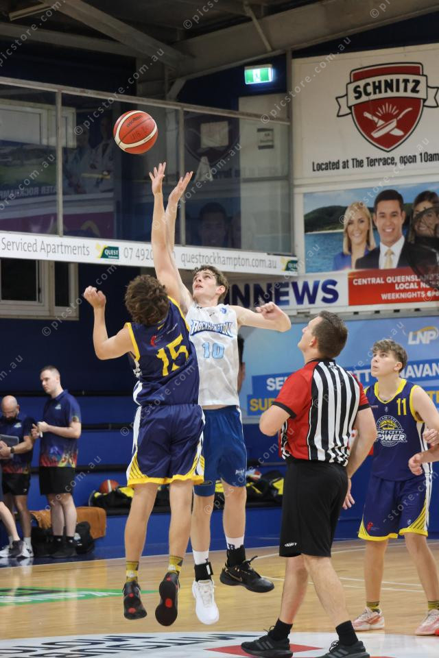Gladstone’s Declan Jones wins the jump ball against Rockhampton’s Lucas McKenzie.