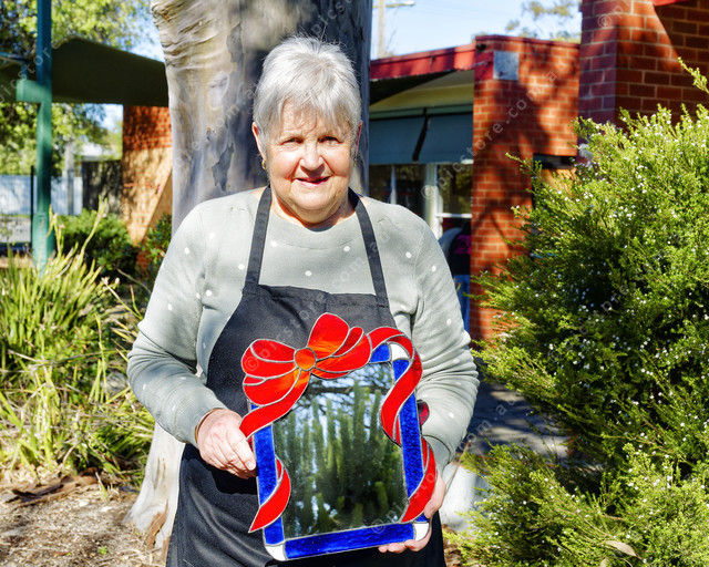 Sue Chreszczyk with a mirror made by Carol Meade (copper foil facilitator) (Ivan Kemp) 496559_06