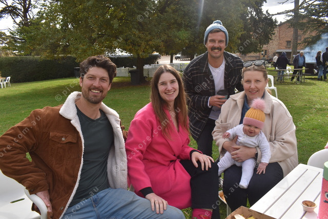 Arthur and Kirsten Densley with Jamie and Lucy Drummond, with Matilda, at Sevenhill Cellars. (478656)