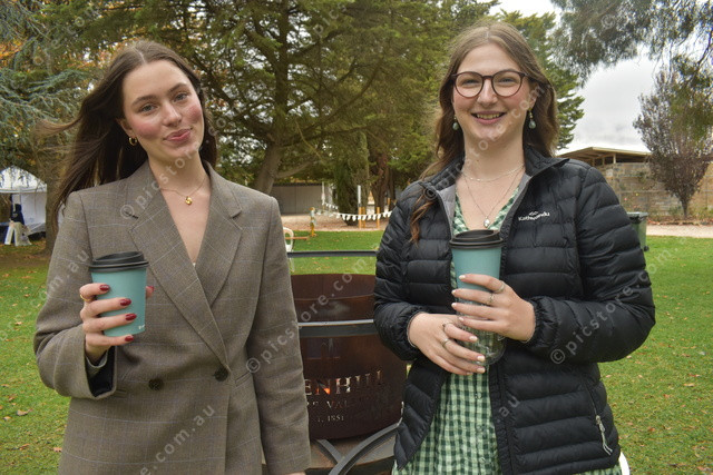 Ivy Wood and Olivia Poole warm up with some coffee in front of one of the fire pits at Sevenhill Cellars. (478656)