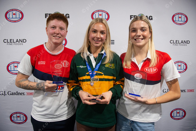 GSFLW A grade leading goal kicker Jess Kirk, of Willunga, best and fairest Grace Deacon, of Myponga-Sellicks, and runner-up best and fairest Bella Rigby, of Willunga, were celebrated at the awards night on Tuesday, July 29. (Dani Brown: 493246_01)