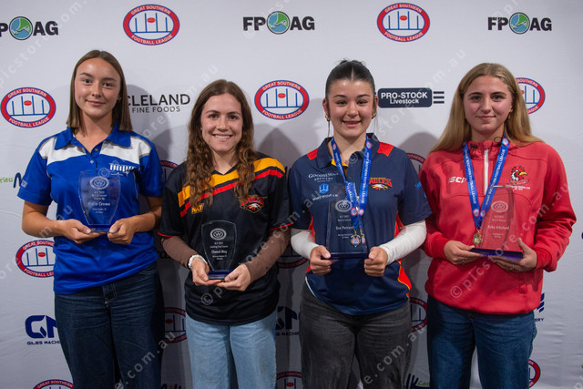Under 17 runner-up best and fairest Halle Crowe, of Victor Harbor, leading goal kicker Chanel May, of McLaren Districts, and joint best and fairests Eva Petrucci, of McLaren Districts, and Ruby Erbsland, of Strathalbyn. (Dani Brown: 493246_12)
