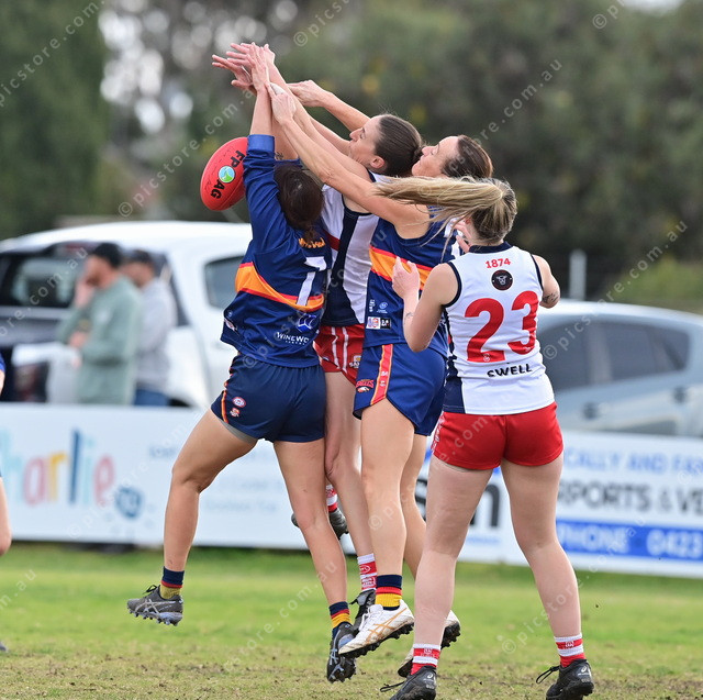 McLaren Districts’ Ally Bailey, Willunga’s Tamara Page, McLaren Districts’ Natasha Threadgold, and Willunga’s Jessica Harris all go up for the contest during the A grade qualifying final. (Mark Liebich: 493945_08)