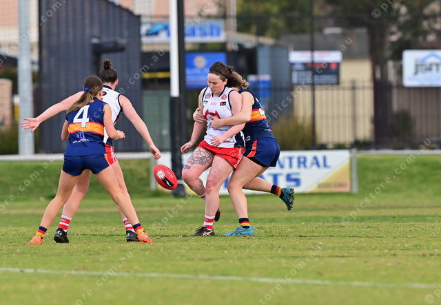 Willunga A grader Emily Cooper is tackled while kicking by McLaren Districts’ Esther Rayner. (Mark Liebich: 493945_26)