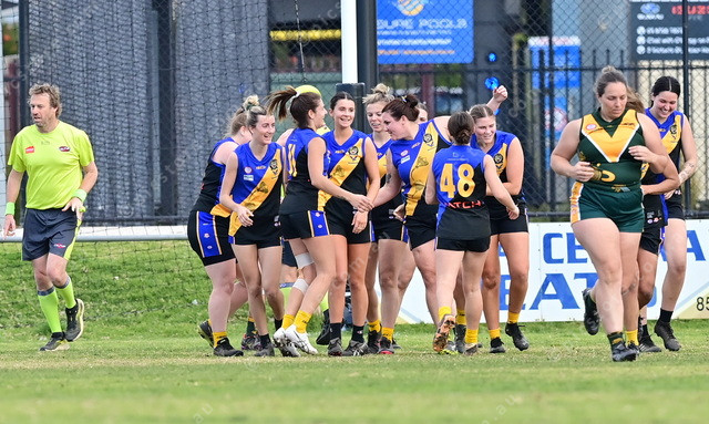 The Stingrays A graders get around captain Kate Sanders after she kicked a goal against Myponga-Sellicks. (Mark Liebich: 493945_30)