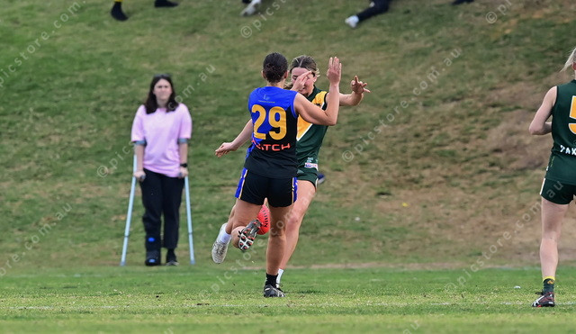 Yankalilla-Encounter Bay’s Sienna Bull lines up for a smother on the kick from Myponga-Sellicks’ Eden Coleman during the A grade elimination final. (Mark Liebich: 493945_33)