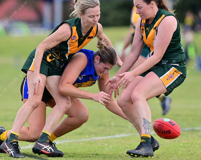 Yankalilla-Encounter Bay’s Matisse Hunter gets down low to grab the ball during the A grade elimination final. (Mark Liebich: 493945_41)