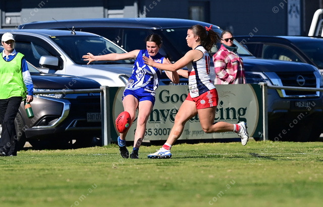 Victor Harbor’s Latika Swain kicks before she is tackled by Willunga’s Izzy Cameron during their under 17 elimination final. (Mark Liebich: 493945_63)