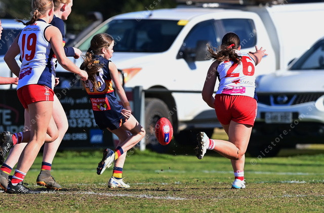 McLaren Districts’ Scarlett Boal gets boot to ball during her under 14 qualifying final against Willunga. (Mark Liebich: 493945_80)