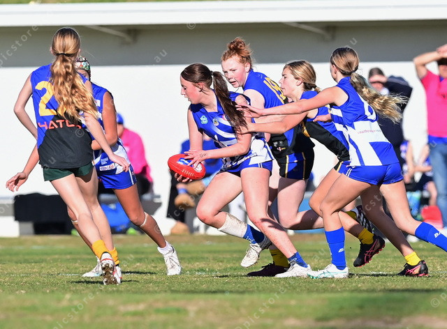 Victor Harbor’s Millicent Walker tries to break away from the intense pressure from the Mudrays players during the under 14s elimination final. (Mark Liebich: 493945_96)