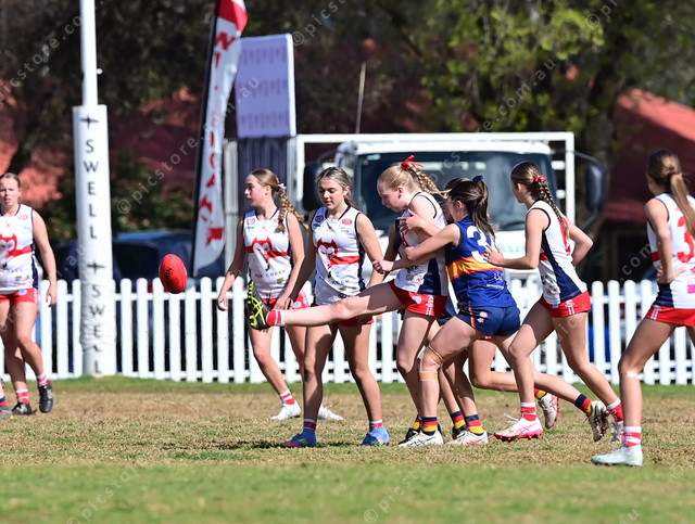 Willunga’s Lola Saunders kicks the ball while being tackled during her under 14 grand final. (Mark Liebich: 496730_35)