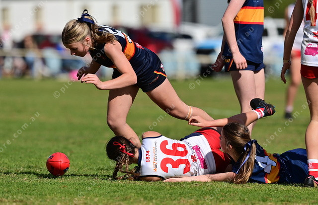McLaren Districts’ Violet Elliker keeps her feet as she chases the ball during her under 14 grand final. (Mark Liebich: 496730_37(