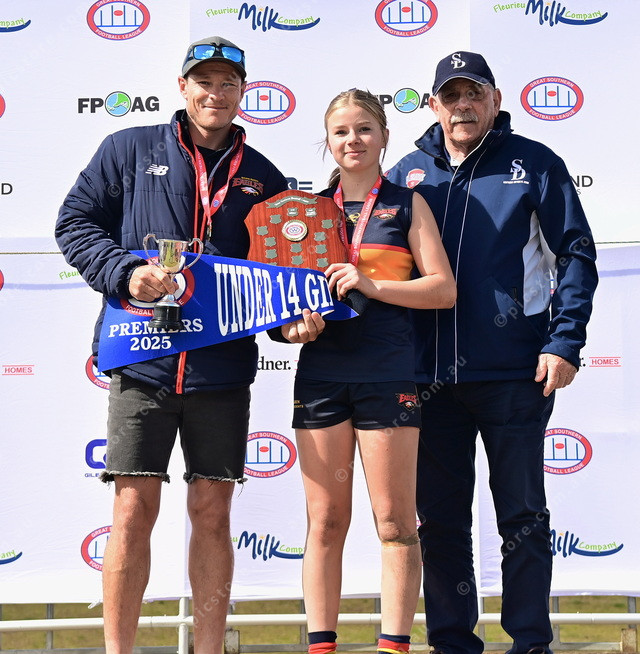 McLaren Districts under 14 coach Stephen Thompson and captain Violet Elliker are presented the premiership cup, shield, and flag by Southern District zone chair Terry Corcoran. (Mark Liebich: 496730_42)