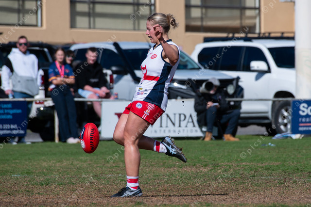 Willunga A grade captain Jodie Hunt kicks a goal in the grand final. (Dani Brown: 497590_02)