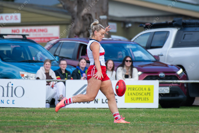 Sending the ball into the forward 50 is Willunga A grader Courtney Gutschmidt. (Dani Brown: 497590_07)