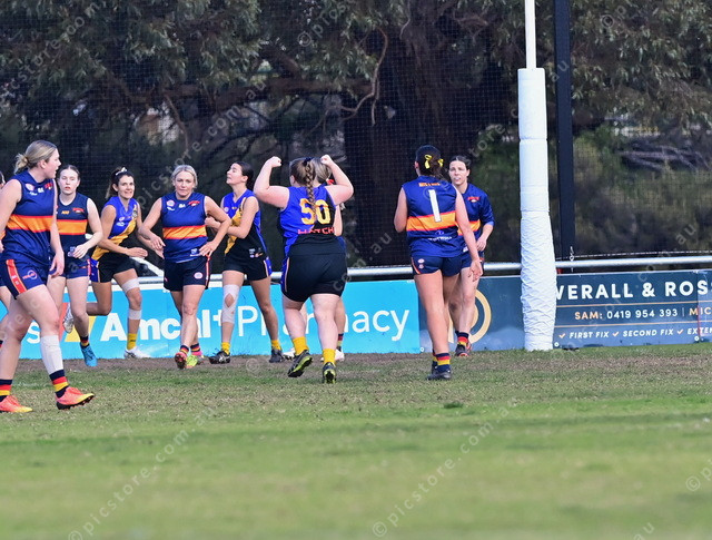 Yankalilla-Encounter Bay’s Dani Brown celebrates kicking the first goal in the opening minutes of the A grade prelim final. (Mark Liebich: 495315_05)