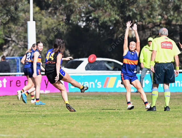 Yankalilla-Encounter Bay ruck Rhiannon Gaythwaite-Cotton boots the ball forward during the A grade prelim. (Mark Liebich: 495315_06)