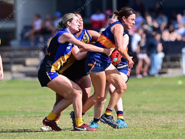 Yankalilla-Encounter Bay’s JArdel Barker and Kelesha Rewiti-Edwards try to bring down McLaren Districts’ Ally Bailey during the A grade prelim final. (Mark Liebich: 495315_13)