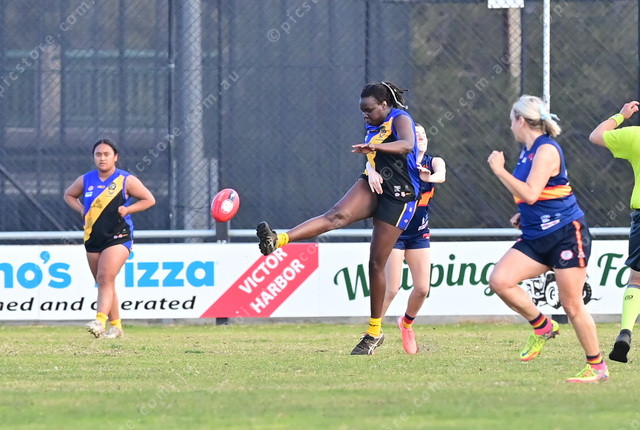 Yankalilla-Encounter Bay’s Achol Agany is able to kick away while being tackled by McLaren Districts’ Makenzie Bryowsky in the A grade prelim final. (Mark Liebich: 495315_15)
