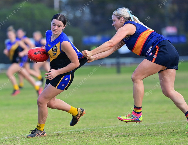 Yankalilla-Encounter Bay’s Halle James tries to shake the grip of McLaren Districts’ Olivia Gallio in the A grade prelim final. (Mark Liebich: 495315_16)