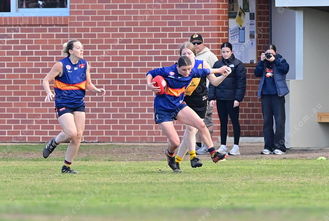 McLaren Districts’ Caitlin Ross tries to work around Yankalilla-Encounter Bay’s Amelia Bilney during the A grade prelim final. (Mark Liebich: 495315_19)