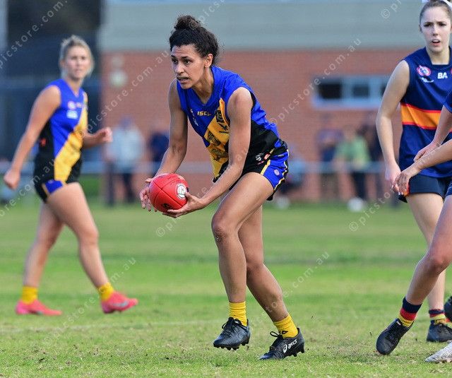 Yankalilla-Encounter Bay’s Czenya Cavouras looks to give off the handball during the A grade prelim final. (Mark Liebich: 495315_25)