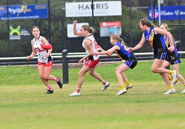 Demon Grace Neville is able to handball away while the Mudrays’ Isla Robinson tries to tackle her in the under 14 prelim final. (Mark Liebich: 495315_62)