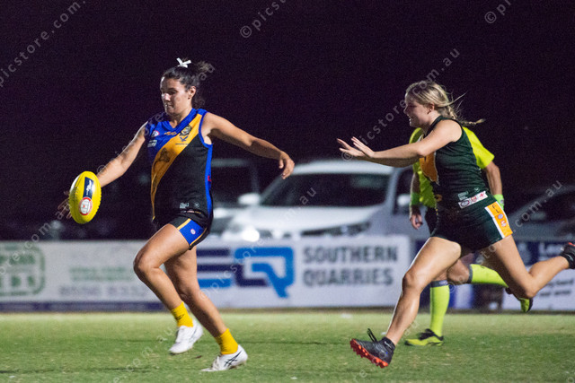 Yankalilla-Encounter Bay’s Tyler Rigney Garrett breaks away from her Myponga-Sellicks opponent, Sophie Magor, on Friday night. (Dani Brown: 468820_01)