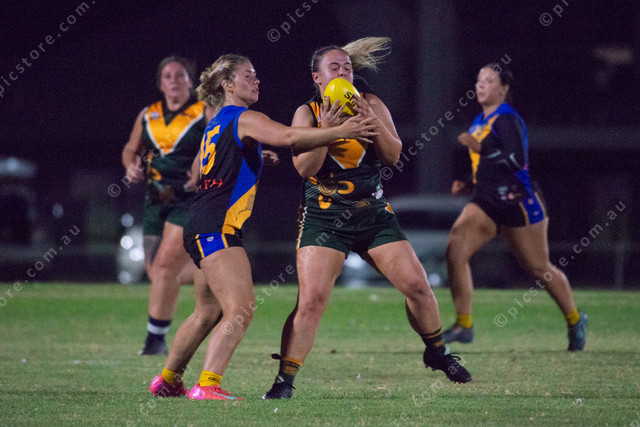 Myponga-Sellicks’ Bria Kennewell takes possession in front of Yankalilla-Encounter Bay’s Eve Jansen on Friday night. (Dani Brown: 468820_03)