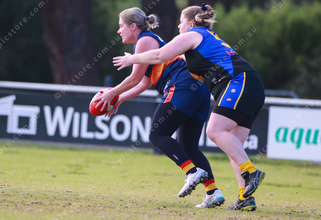 McLaren Districts’ Carly Vanderkwast is about to be tackled by Yankalilla-Encounter Bay’s Dani Brown during their A grade match. (Jesse Ehlers: 484452_04)