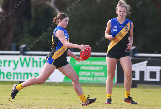 Yankalilla-Encounter Bay’s Halle James has a shot on goal in the A grade. (Jesse Ehlers: 484452_06)