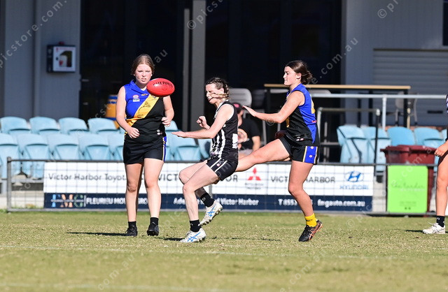 Yankalilla-Encounter Bay’s Halle James kicks the ball forward while Goolwa-Port Elliot’s Lilli Mitchell tries to smother during the A grade match. (Mark Liebich: 485884_11)