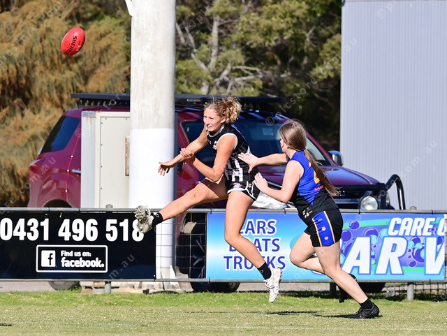 Goolwa-Port Elliot A grader Lily Jenke gets boot to ball before it can be smothered. (Mark Liebich: 485884_12)