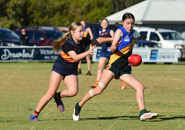 Mudray Abbie-Shae Robins breaks away from Sheagle Alexis Domas during their under 14s match. (Mark Liebich: 485884_33)