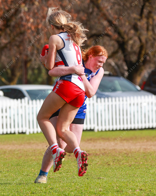 Willunga’s Ebony Smith is wrapped up by Victor Harbor’s Zoe Bartholomaeus during their under 17s match. (Jesse Ehlers: 487311_08)