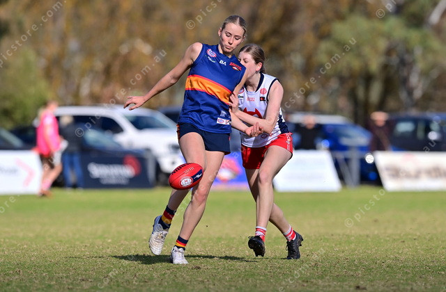 Getting boot to ball during her A grade match is McLaren Districts’ Mia Hamilton. (Mark Liebich: 488611_07)