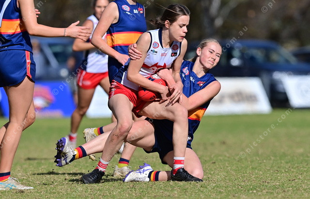 McLaren Districts’ Mia Hamilton has Willunga’s Ada Anninos wrapped up in a solid tackle during their A grade match. (Mark Liebich: 488611_08)