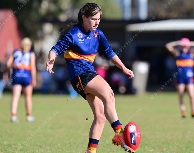 McLaren Districts’ Ruby Flanagan-Sjoberg gets boot to ball during the A grade match. (Mark Liebich: 488611_12)