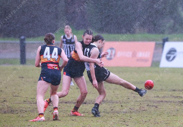 Goolwa-Port Elliot’s Ruby Broecklemann gets boot to ball while being tackled in the under 14s. (Jesse Ehlers: 492554_02)