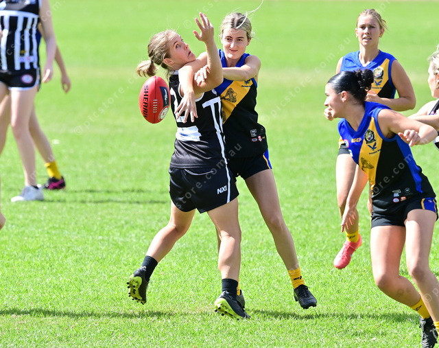 The battle between Goolwa-Port Elliot’s Ellie Fry and Yankalilla-Encounter Bay’s Jardel was fierce and fast. (Mark Liebich: 470354_04)