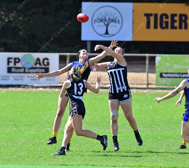 Yankalilla-Encounter Bay’s Rhiannon Gaythwaite-Cotton and Goolwa-Port Elliot’s Jessica Bailey go up for the contest in their A grade round two match. (Mark Liebich: 470354_06)