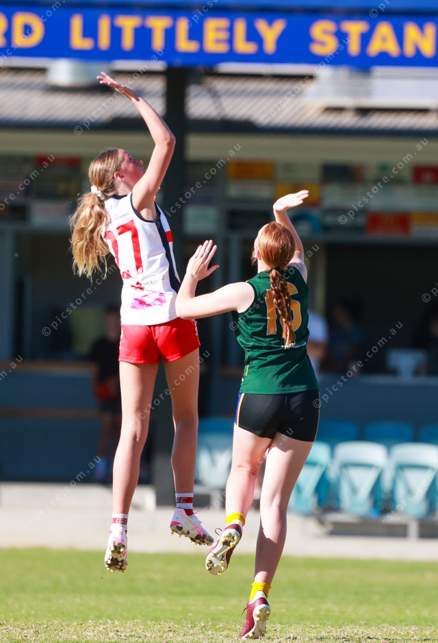 The Demons’ Isla Boss and the Mudrays’ Maggie-Rose Mallord go up for the ruck during their under 14s match. (Jesse Ehlers: 471818_01)