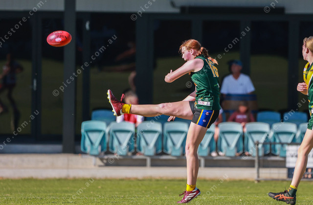Mudrays’ Maggie-Rose Mallord kicks the ball through the middle during her under 14s game. (Jesse Ehlers: 471818_05)