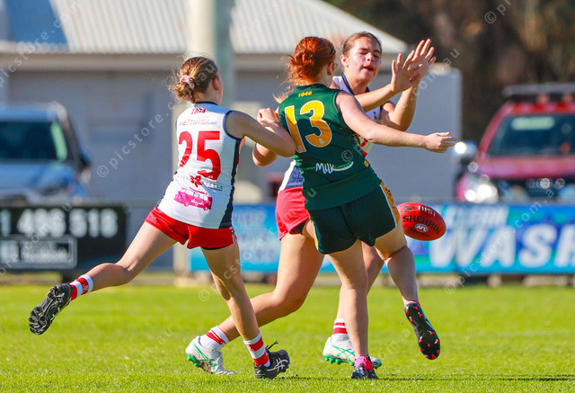 Eloise O’Callaghan kicks the ball while under two lots of pressure in the under 14s. (Jesse Ehlers: 471818_09)